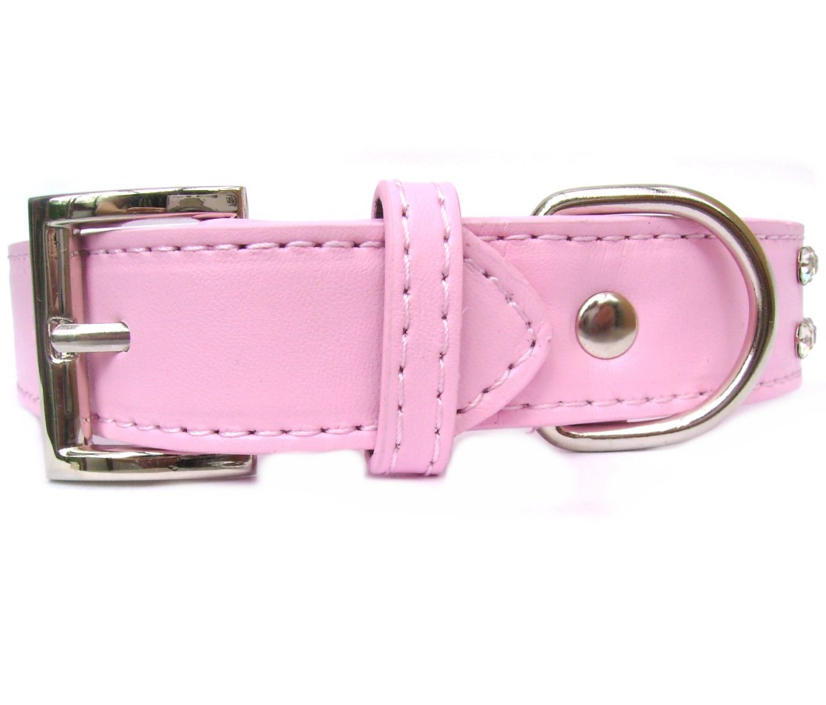 Diamante dog collars made of high-quality imitation-leather. There are two rows of sparkling clear rhinestones, which are securely riveted. There is also a D-ring so that the lead can be easily attached, as well as a strong buckle.