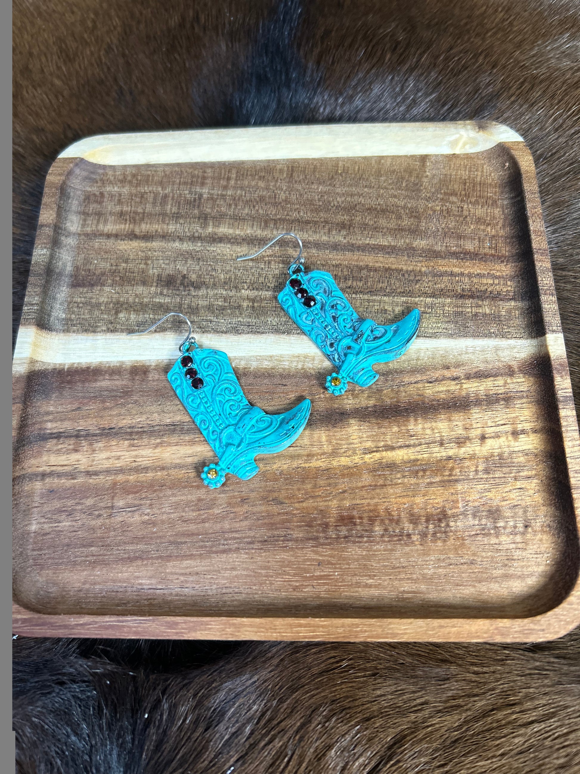 These charming boot-shaped earrings bring a touch of Wild West flair to any outfit. Crafted with antique turquoise accents, they capture that authentic cowgirl spirit with rustic elegance. Perfect for rodeo season, country concerts, or anyone who loves bold western style. Lightweight and easy to wear, they're the ideal accessory for making a statement without the fuss. Saddle up your jewelry collection with these playful, eye-catching stunners.