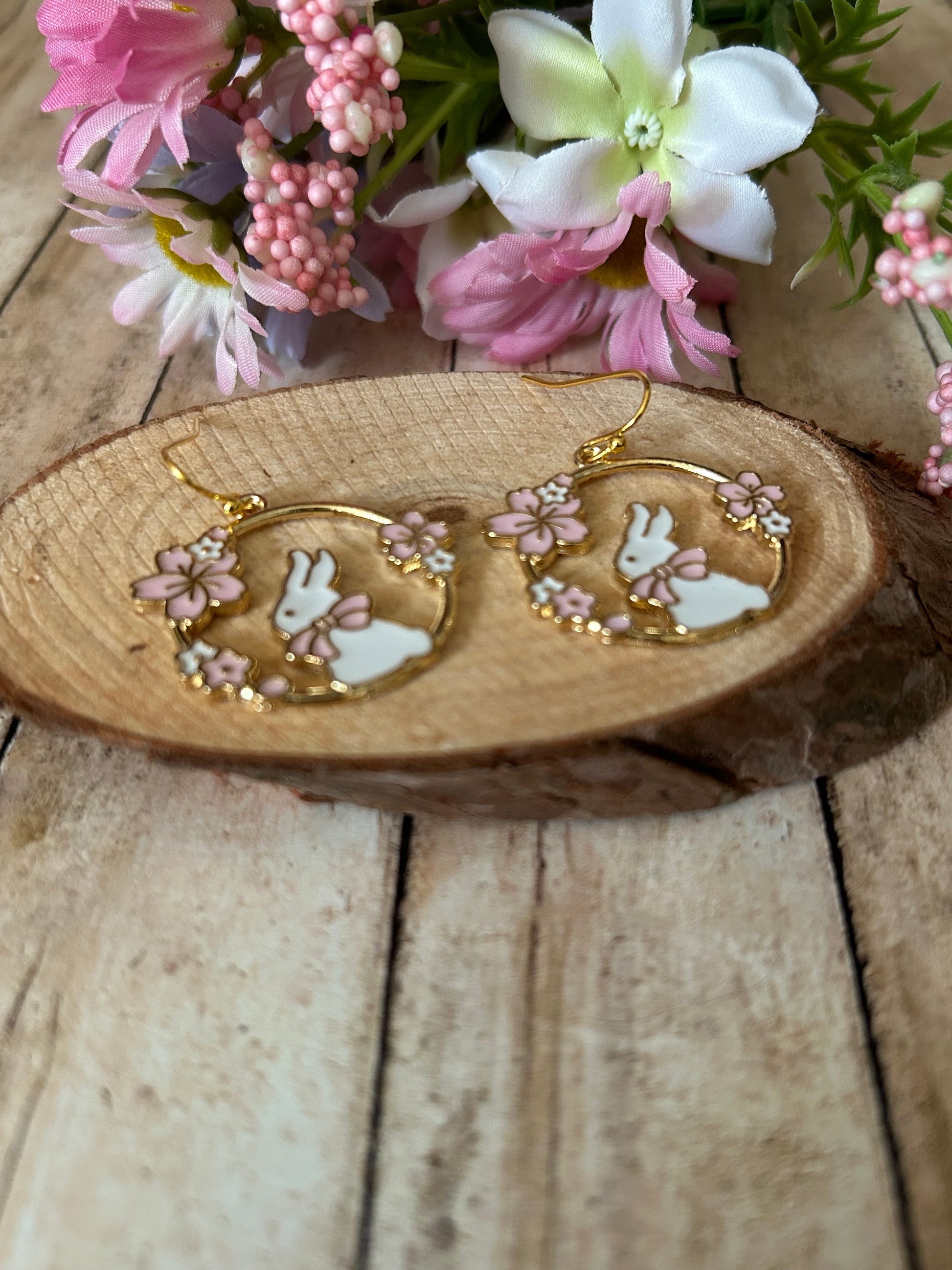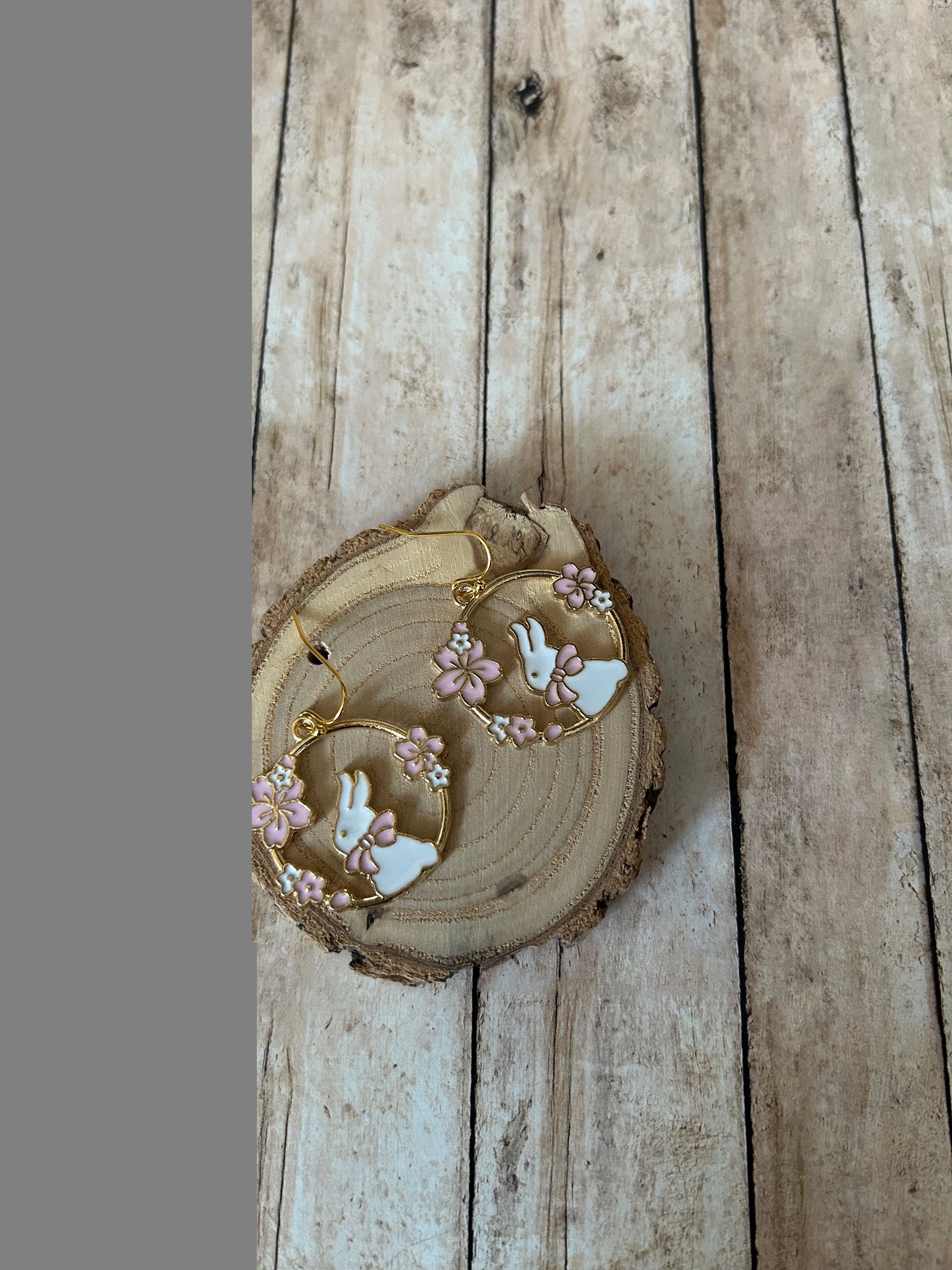 Celebrate Easter in style with our adorable Easter Bunny Rabbit with Flowers earrings. Perfect for adding a touch of springtime charm to any outfit.