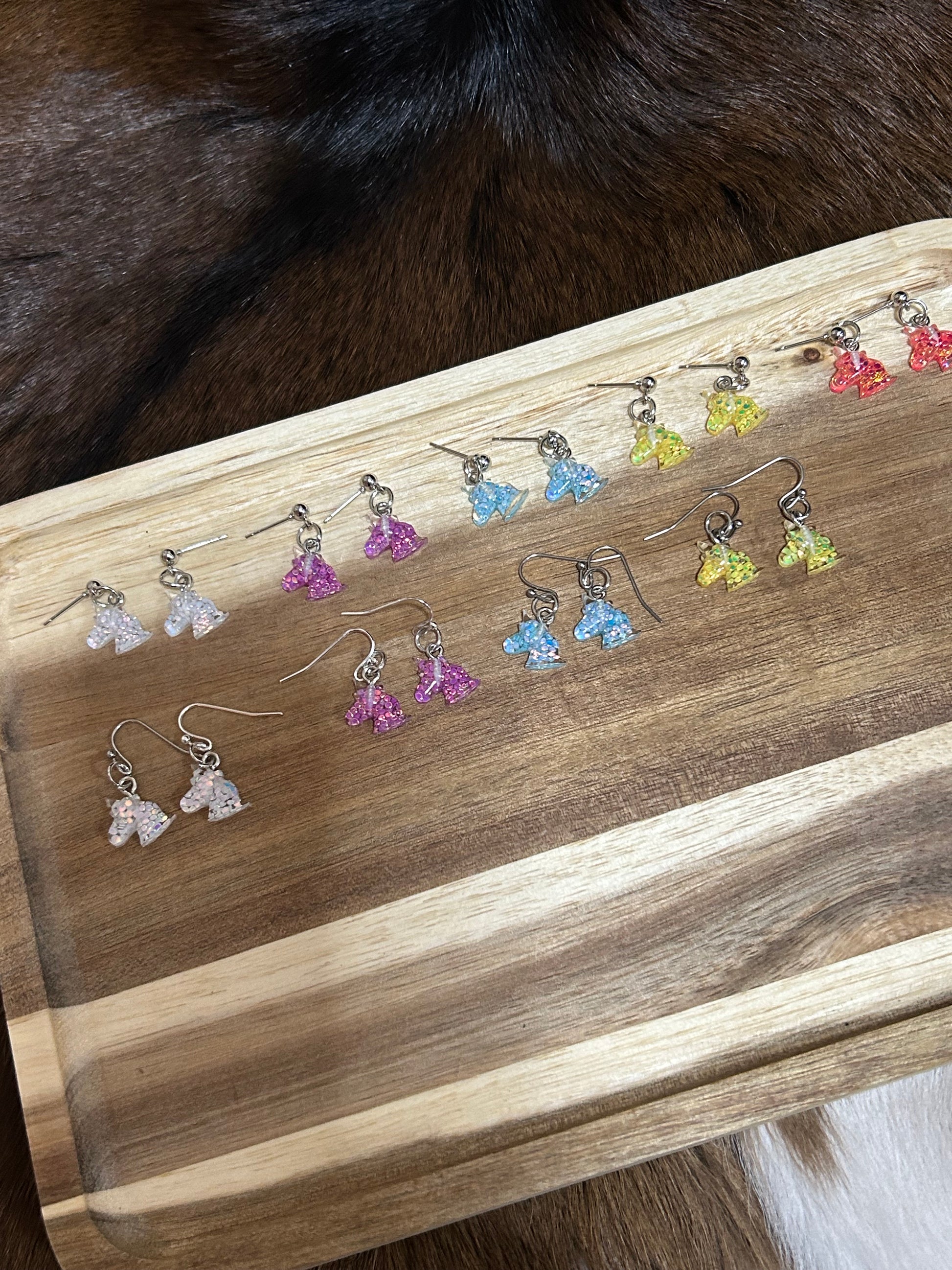 These adorable horse head earrings bring a touch of sparkle and western charm to any young equestrian's jewelry collection. Crafted with glittery details that catch the light, they're perfect for horse lovers who want to show off their passion in style. Lightweight and comfortable for all-day wear, these playful earrings make a fun gift for birthdays, holidays, or just because. Saddle up your accessory game with these eye-catching beauties!