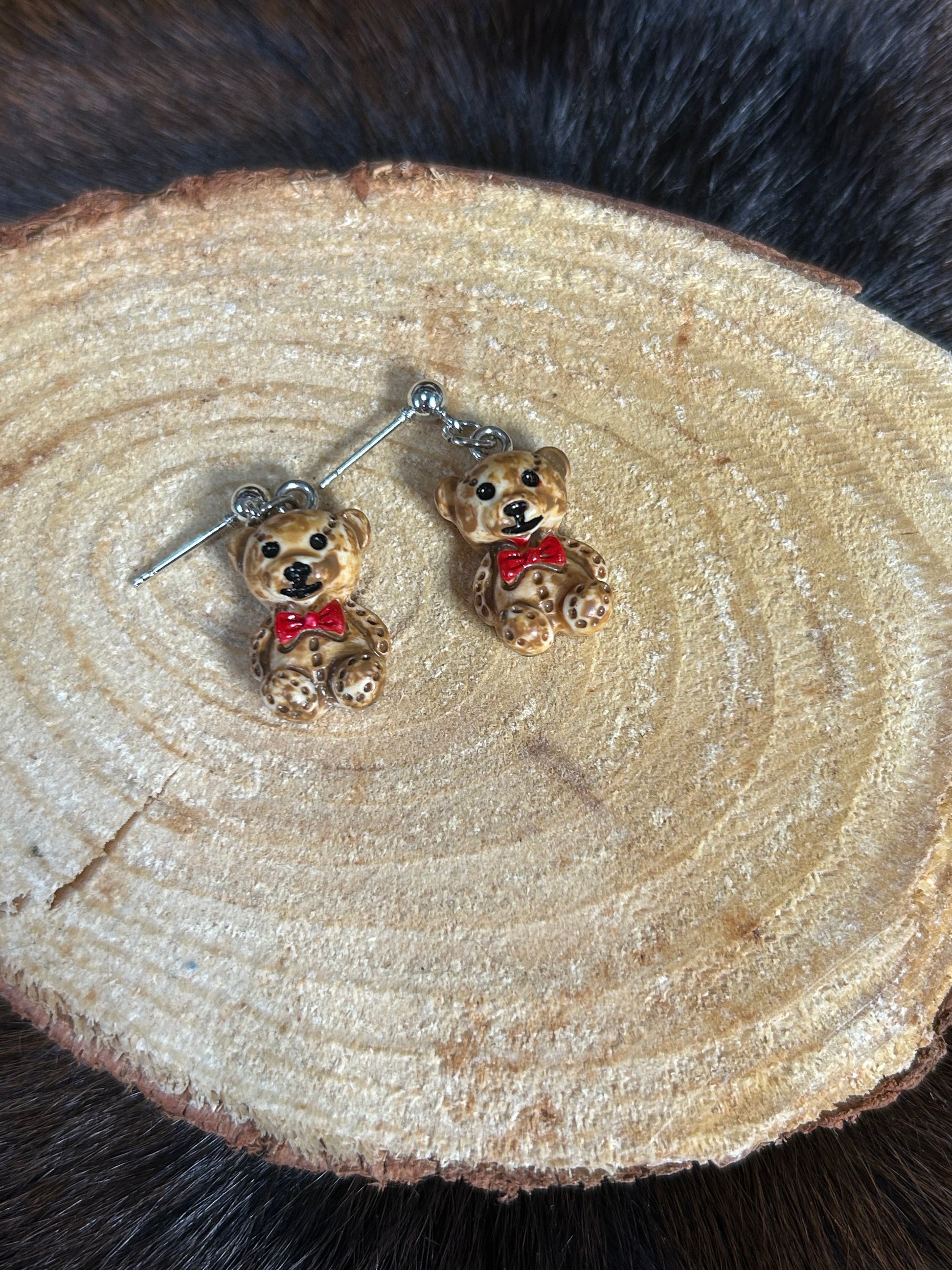 Girls Little Bear Stud Earrings, made from resin. Bear has a little red bowtie.