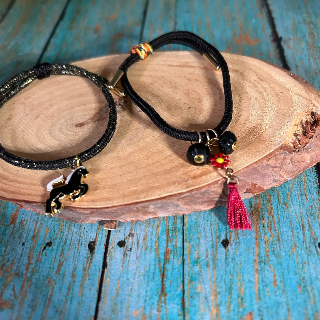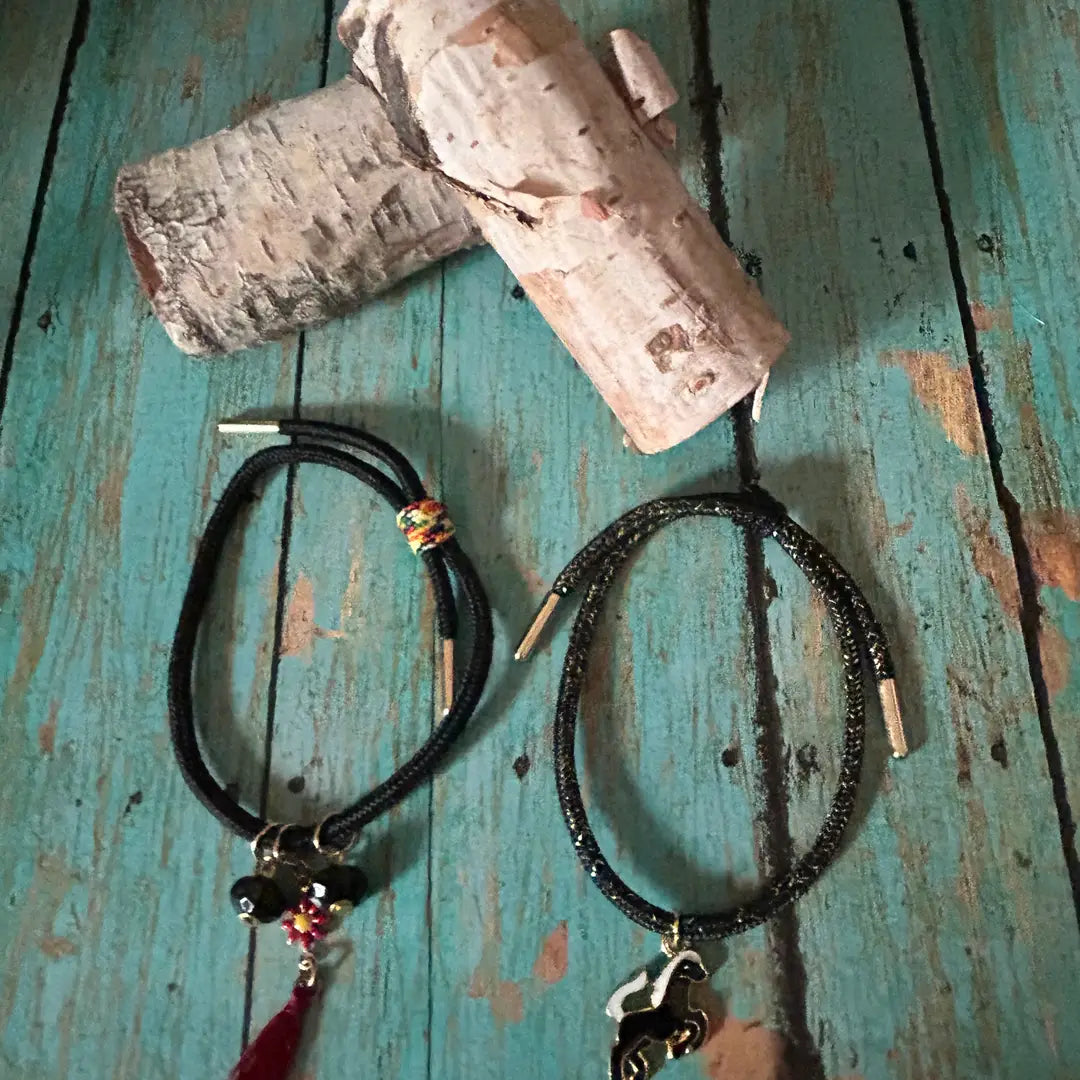 Our lightweight para Cord Western Horse or Tassel Bracelets are meticulously handcrafted with durable black braided cord, accented with two beads and a vibrant red tassel. Add a touch of western flair to your jewelry collection.