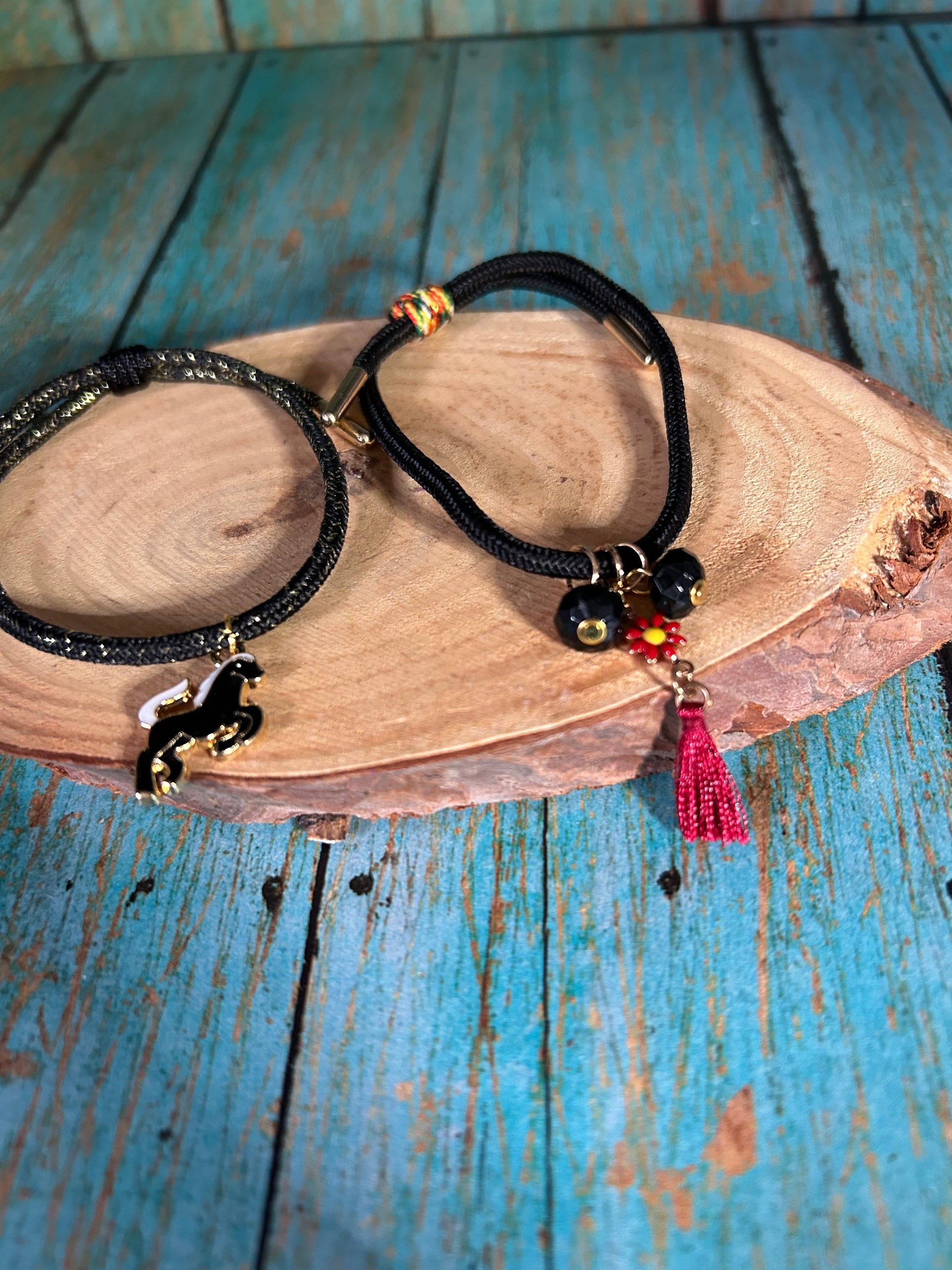 Our lightweight para Cord Western Horse or Tassel Bracelets are meticulously handcrafted with durable black braided cord, accented with two beads and a vibrant red tassel. Add a touch of western flair to your jewelry collection.