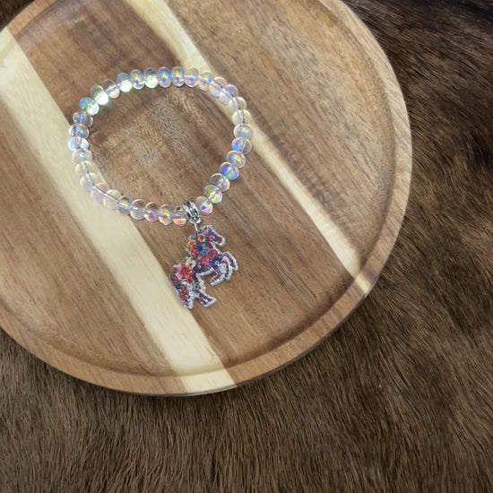 Brighten her wrist with this eye-catching bracelet featuring vibrant fluorescent beads and an adorable, colorful horse charm. Perfect for young horse lovers and charm collectors, this playful piece combines fun colors with a whimsical western touch. Lightweight and comfortable for all-day wear, it's an ideal gift for birthdays, holidays, or just because. Let her express her personality with this cheerful accessory that captures Montana's wild spirit.