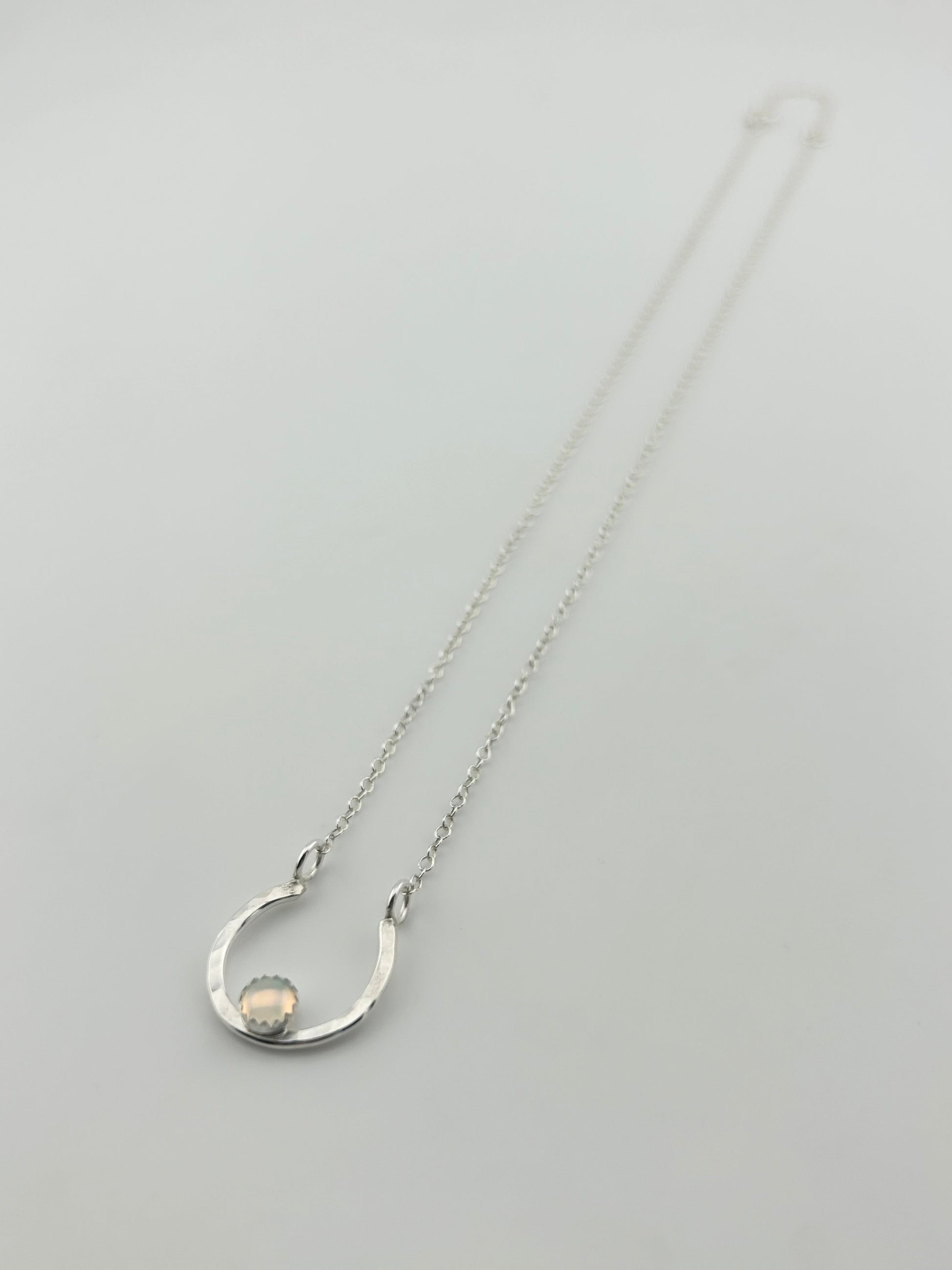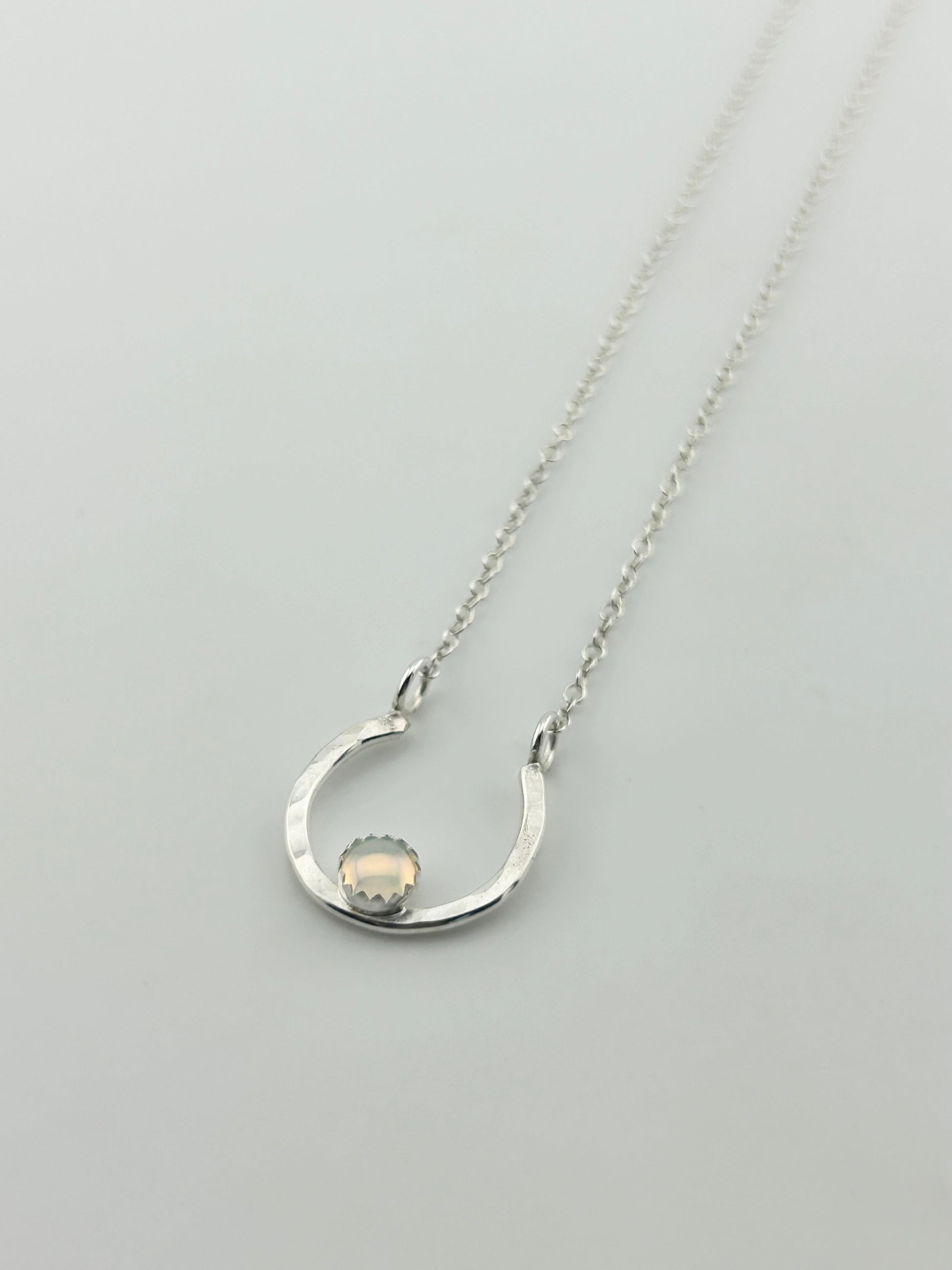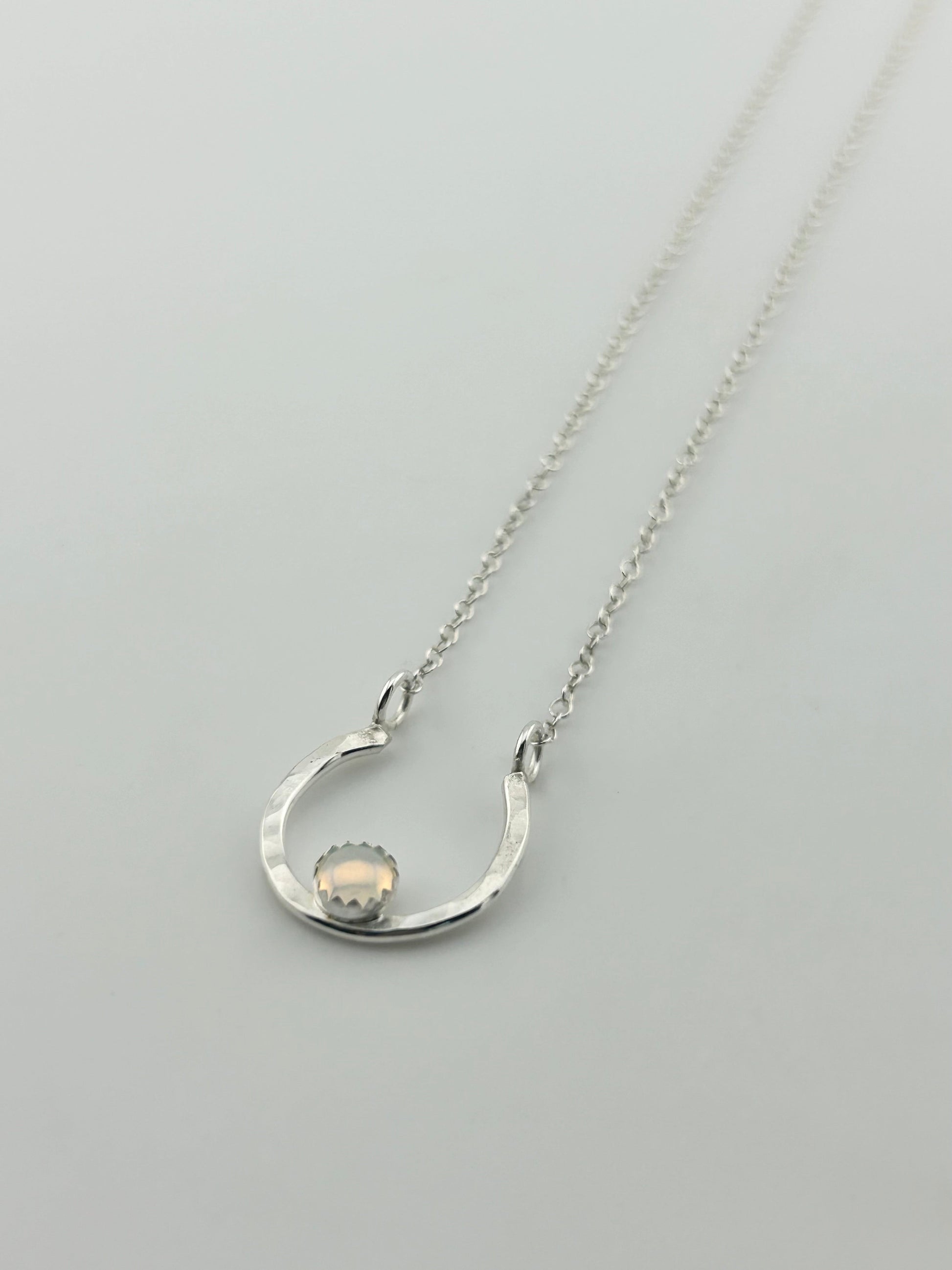 This handcrafted piece features a beautifully shaped horseshoe pendant, symbolizing good fortune and protection with a beautiful 5mm rainbow opal stone.