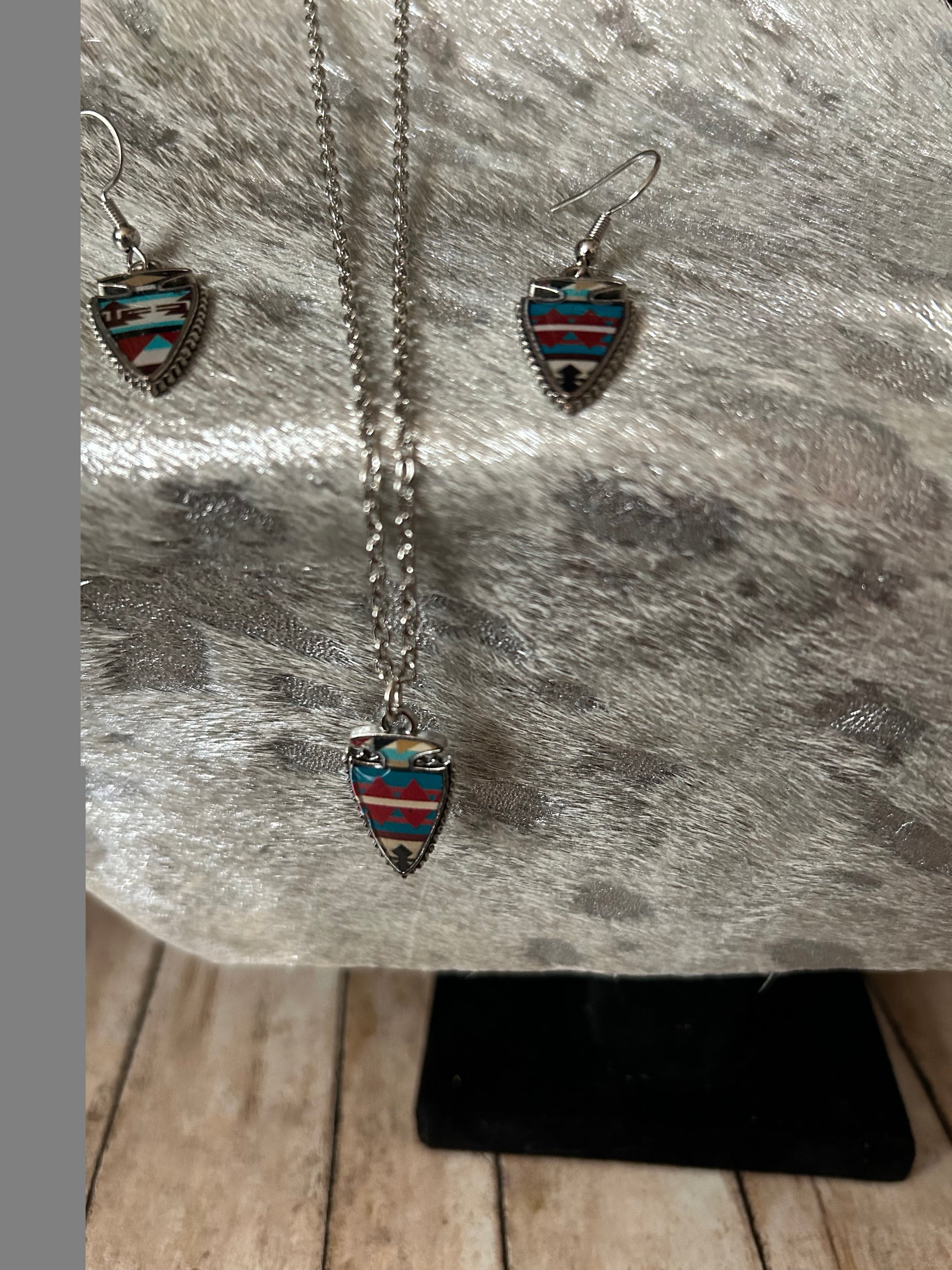 Elevate your style with our Western Arrow Head Necklace Earring Set. Crafted in a Southwestern design, featuring intricate geometric patterns for a touch of elegance.