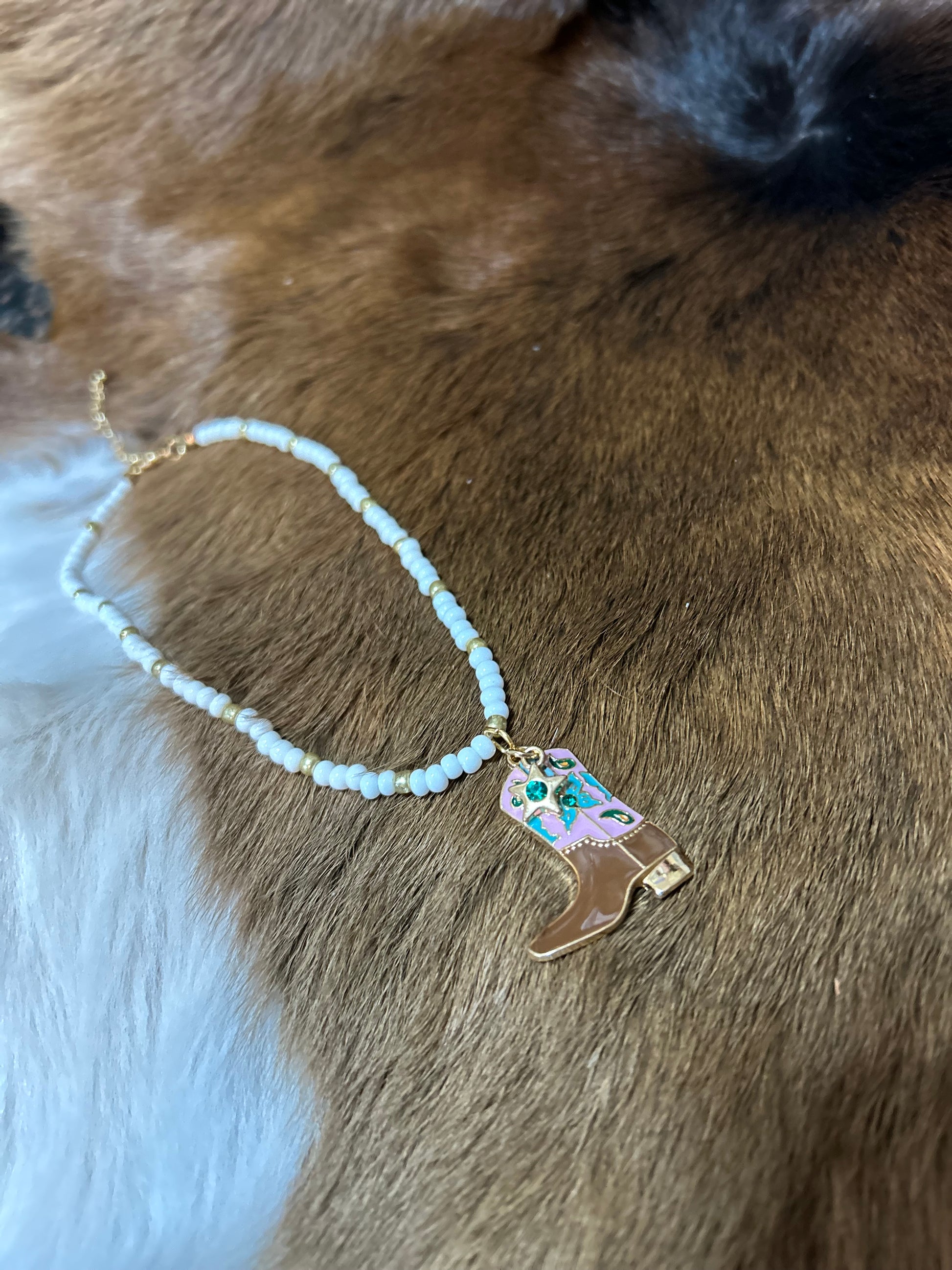 Elevate your Western style with our Western Beaded Boot Necklace. Handcrafted with intricate white and gold beads and a stunning cowboy boot pendant in pink, brown, and turquoise hues.