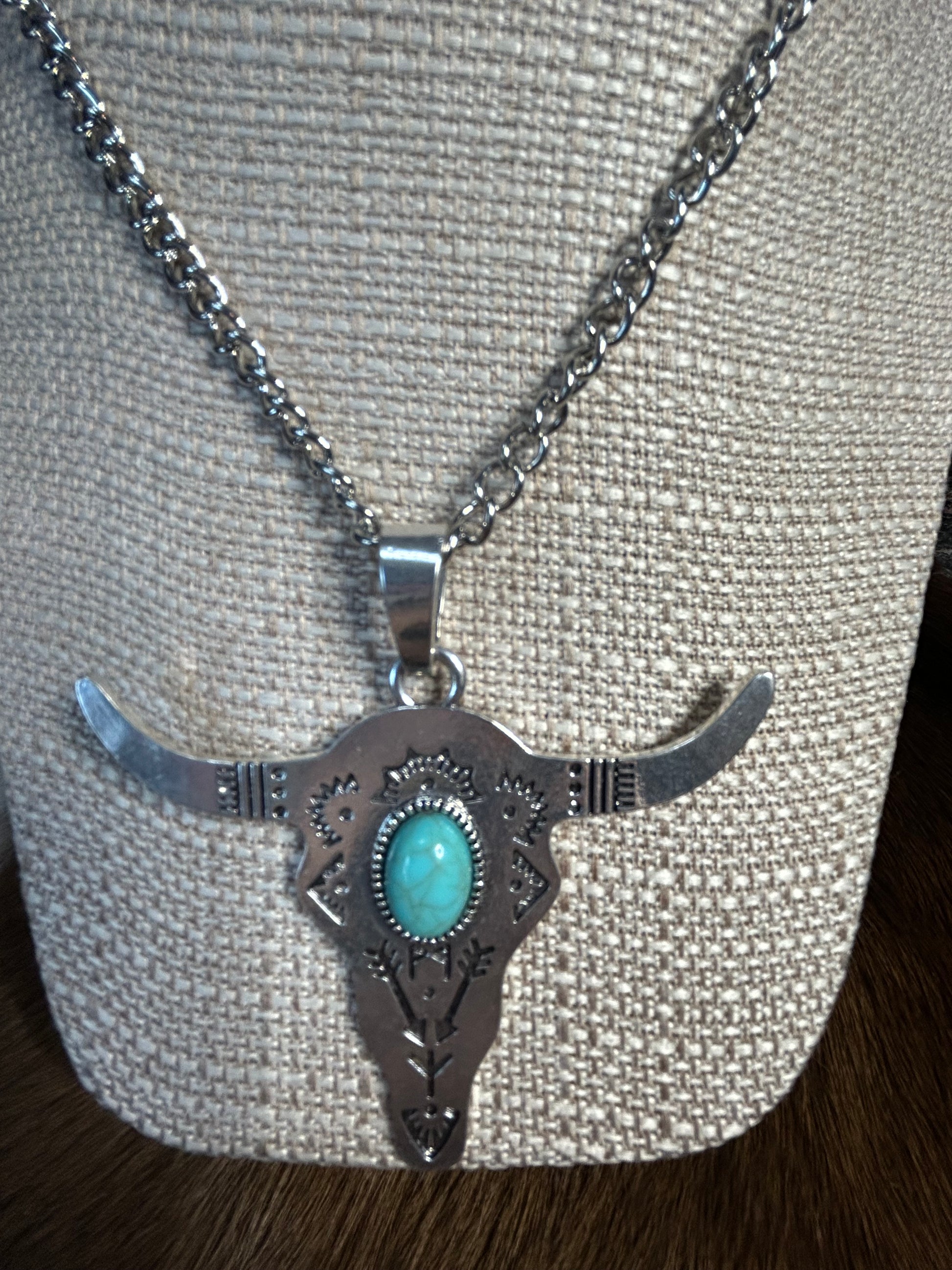 Elevate your Southwestern style with our Western Steer Head Silver Necklace featuring a stunning turquoise stone. Handcrafted with intricate details, this piece is a unique statement accessory.